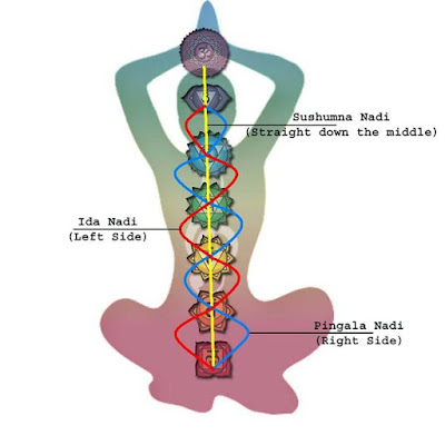 PINGALA: Parte desde el lado derecho del Chackra Muladhara y asciende atravesando los chakras y termina en el Ajna chakra. Cuando prevalece el flujo en este fosa nasal derecha hay tendencia a que aparezca un estado mas de extroversión resultando un momento propicio para comenzar algún trabajo de esfuerzo físico, o cualquier actividad hacia afuera.